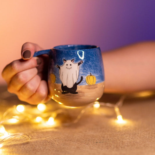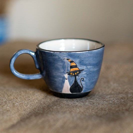Cute Cat Mug - Witch Cat, Black Cat Pottery Mug, Halloween Gift Mug