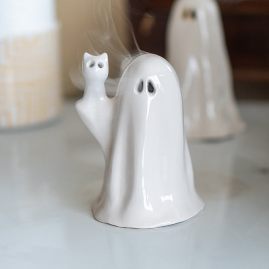Ghost and Cat Incense Holder - Funny Home Decor, Ceramic Incense Burner, Handmade Ghost Figurine