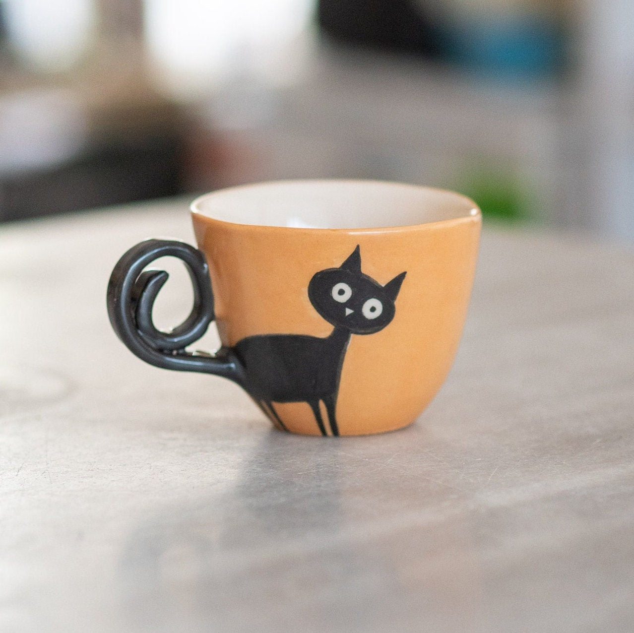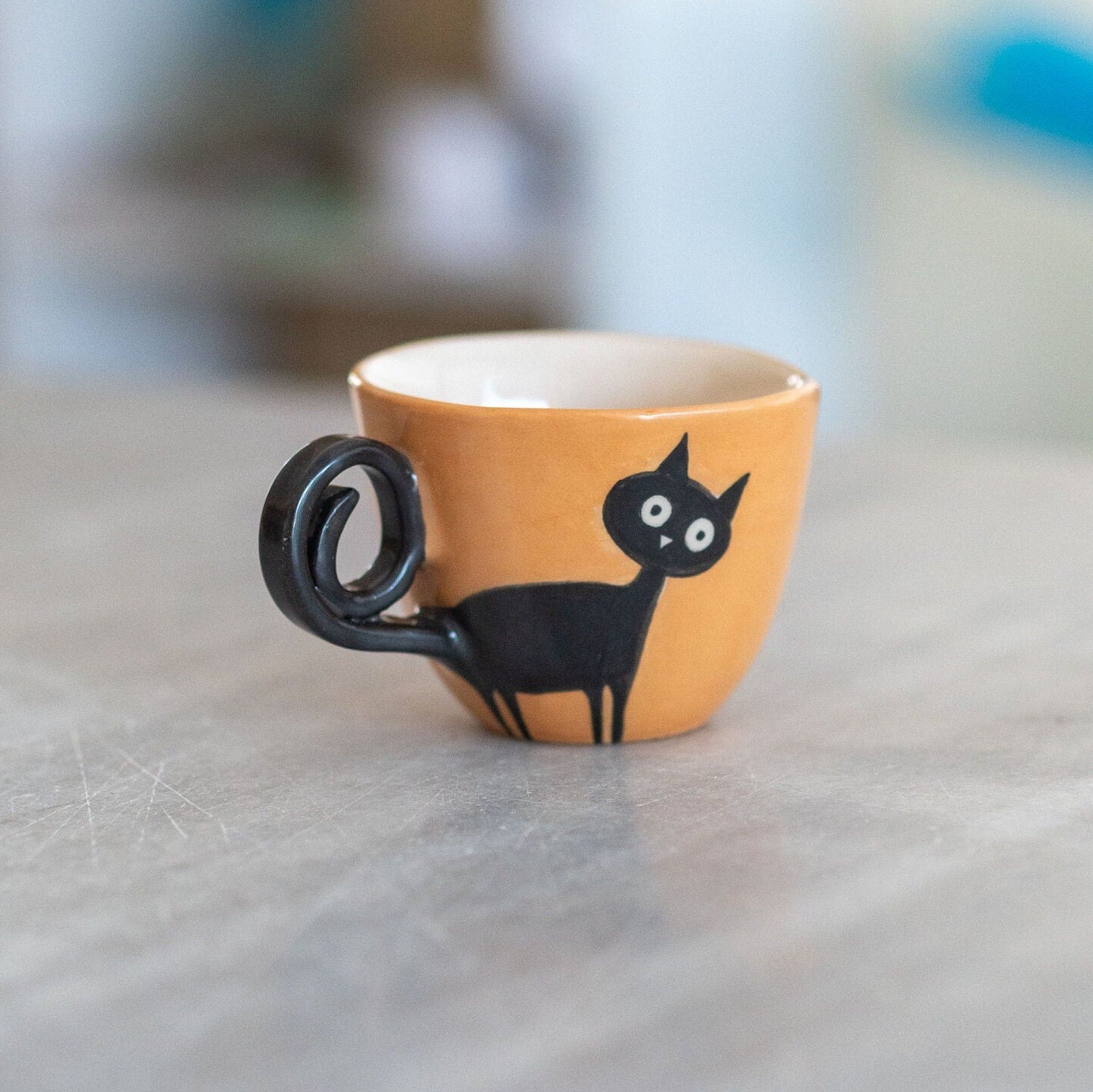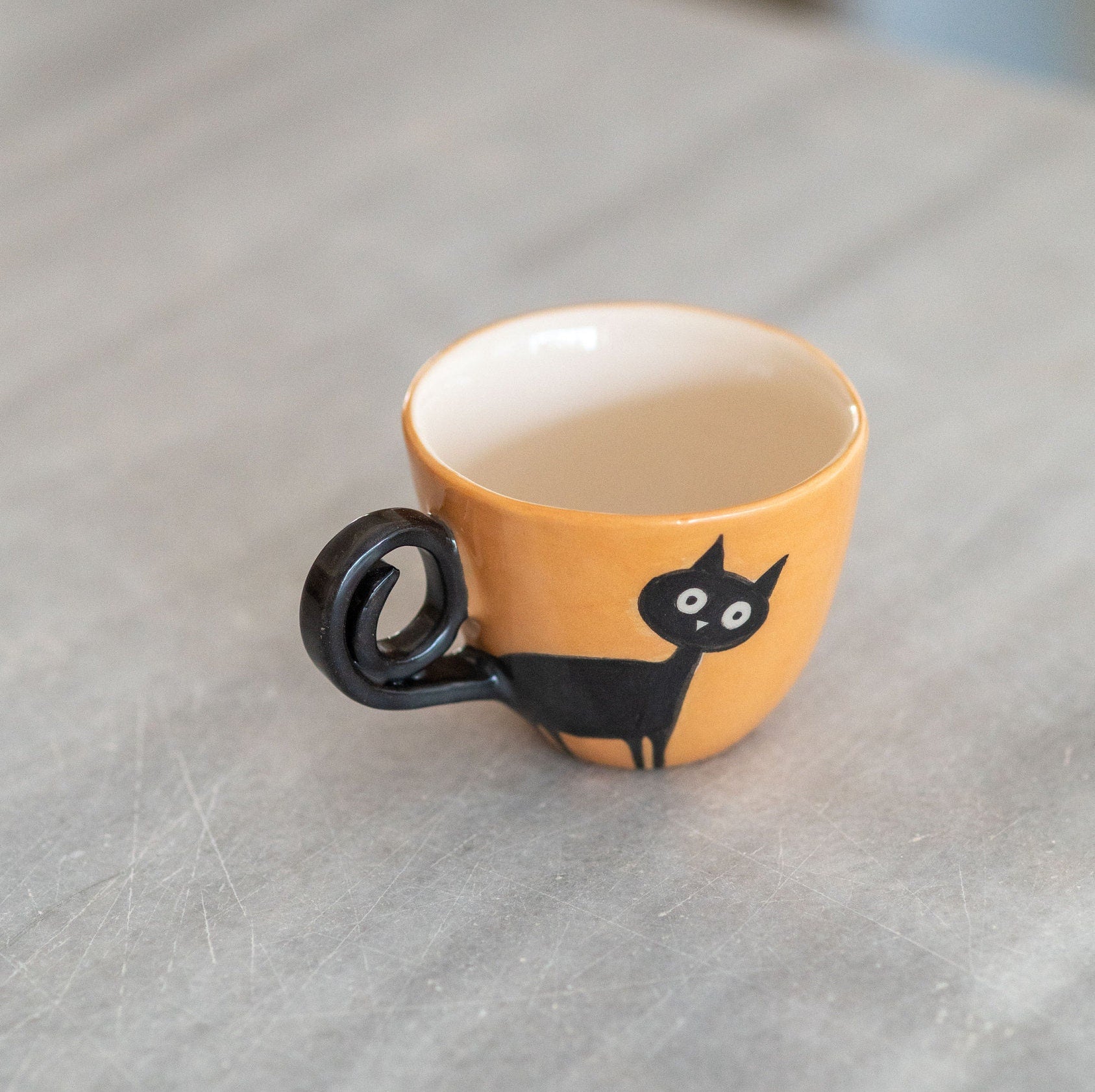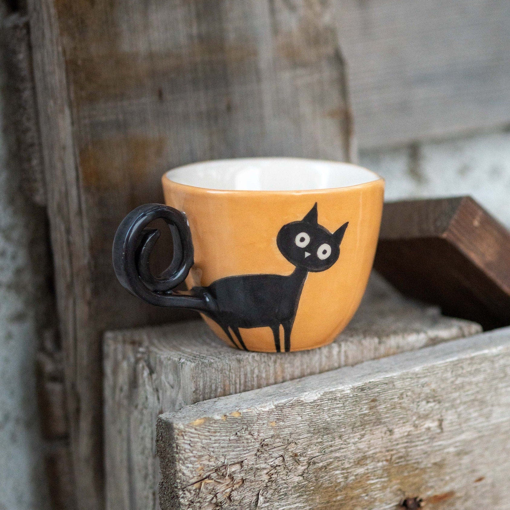 🖌️ Handcrafted with love, this ceramic coffee mug boasts a charming hand-painted black cat design. Notice how the cat's tail elegantly curls around the handle, adding a touch of whimsy to your morning routine.