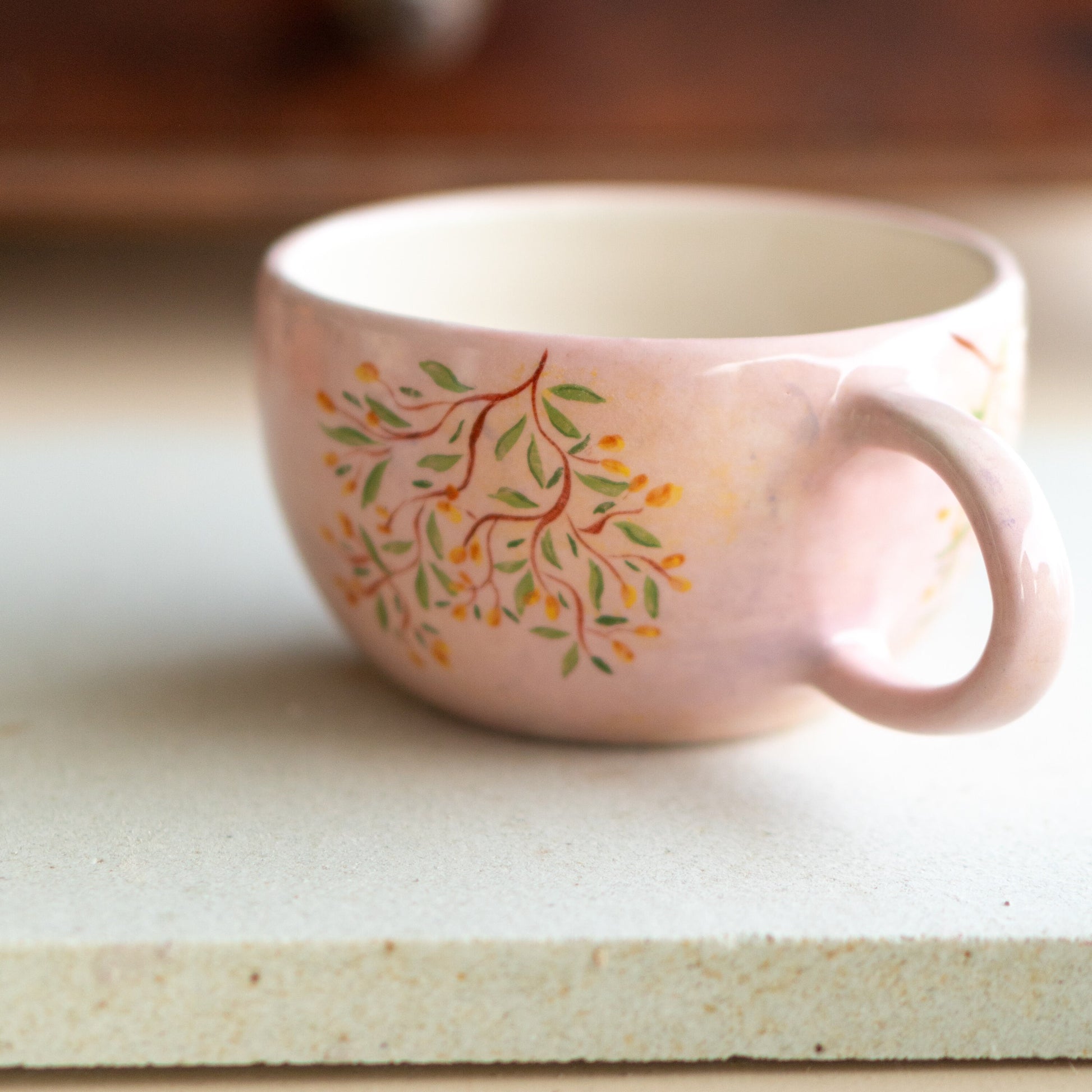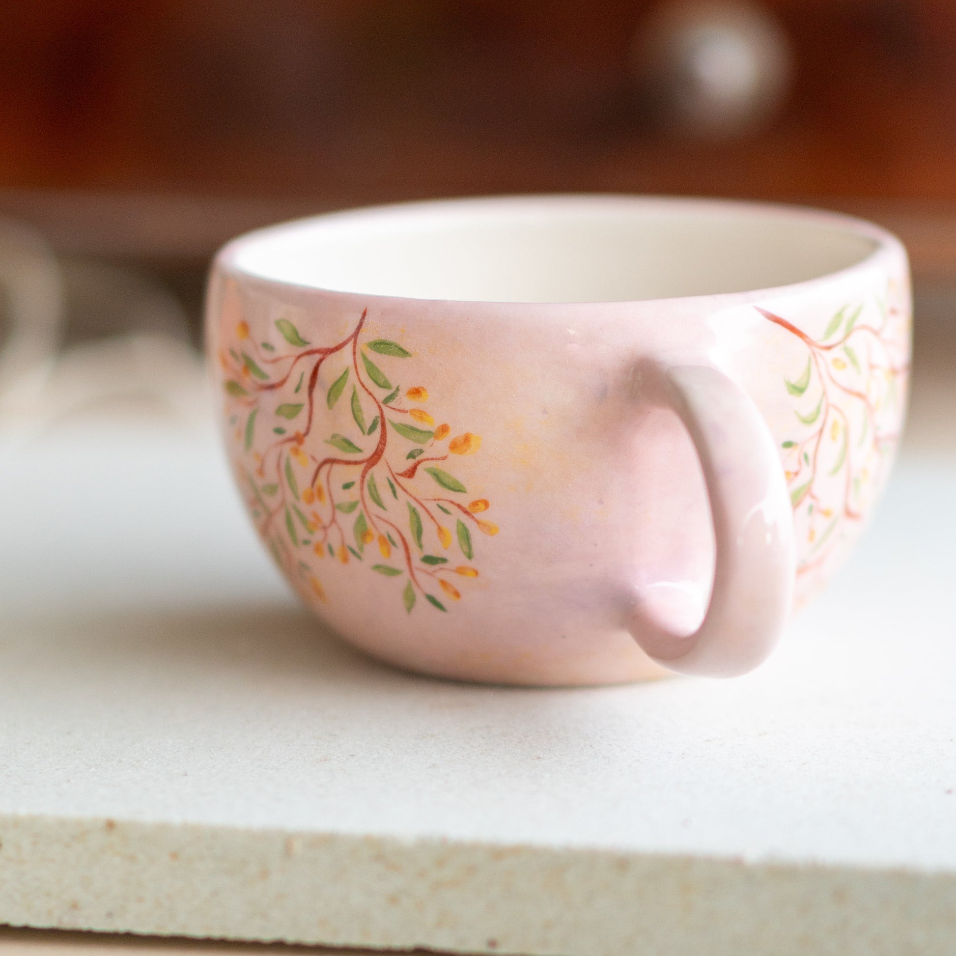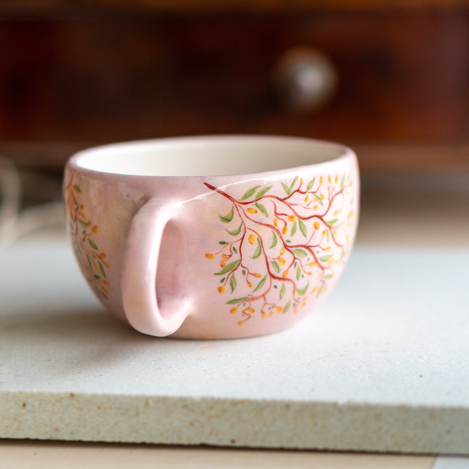 Each Floral Coffee Cup features a hand-painted design that captures the essence of a serene countryside. The delicate branch and berry pattern, set against a soft pastel backdrop, invites the calm of nature right to your table. This piece is more than a mug; it's a celebration of the botanical beauty that surrounds us, crafted with the utmost care and precision by skilled artisans.