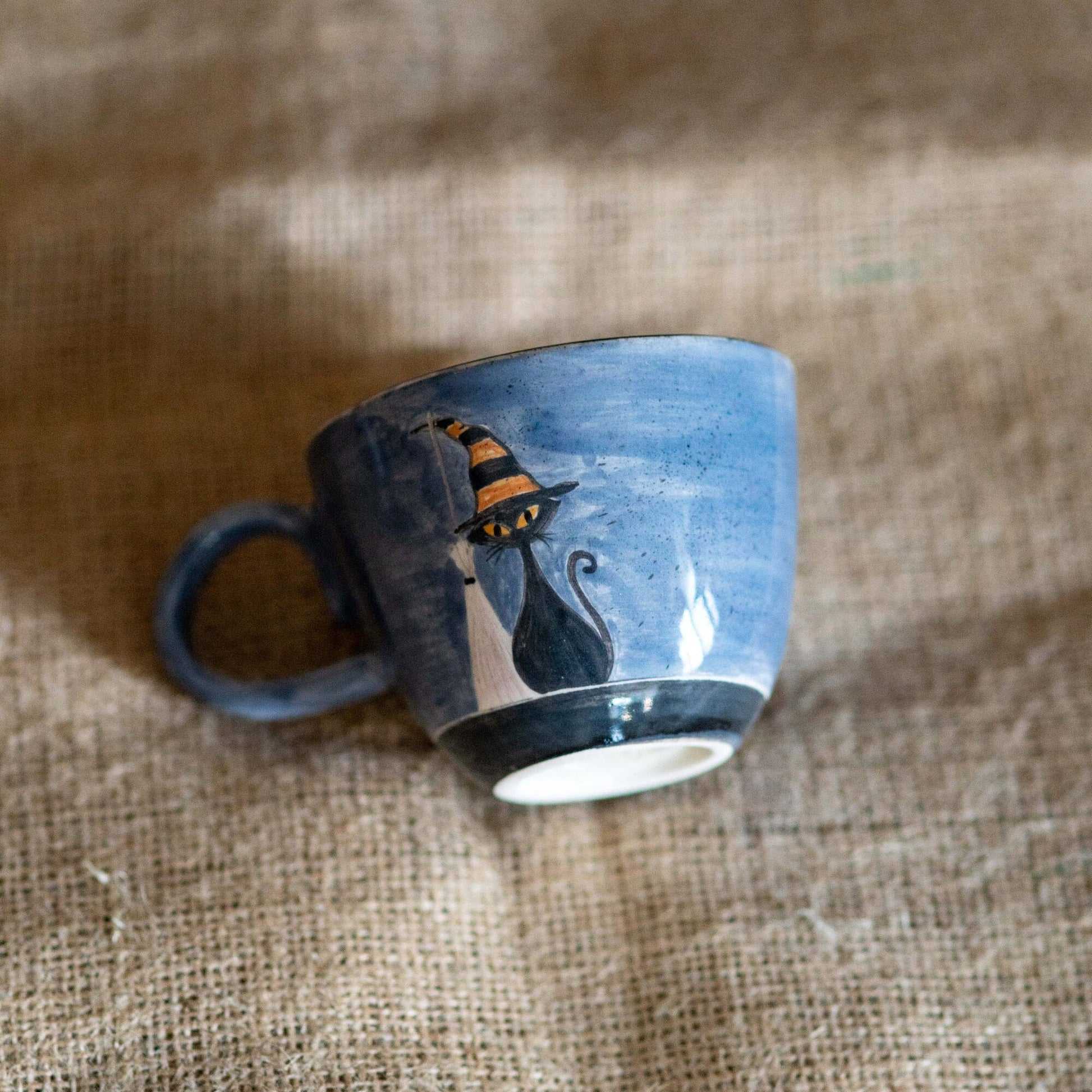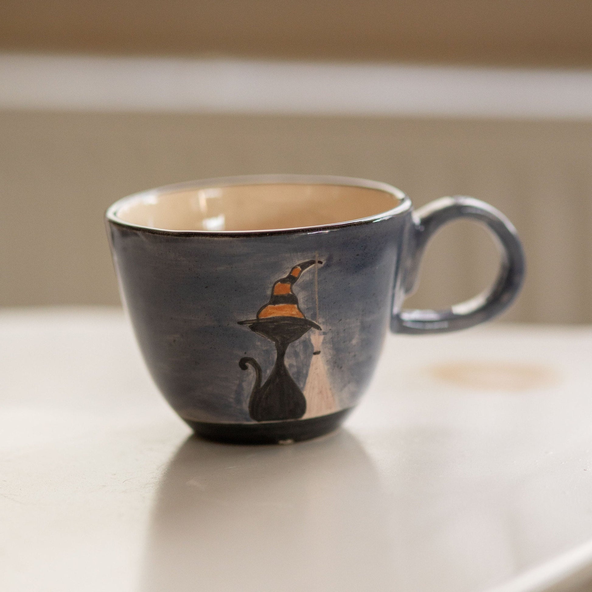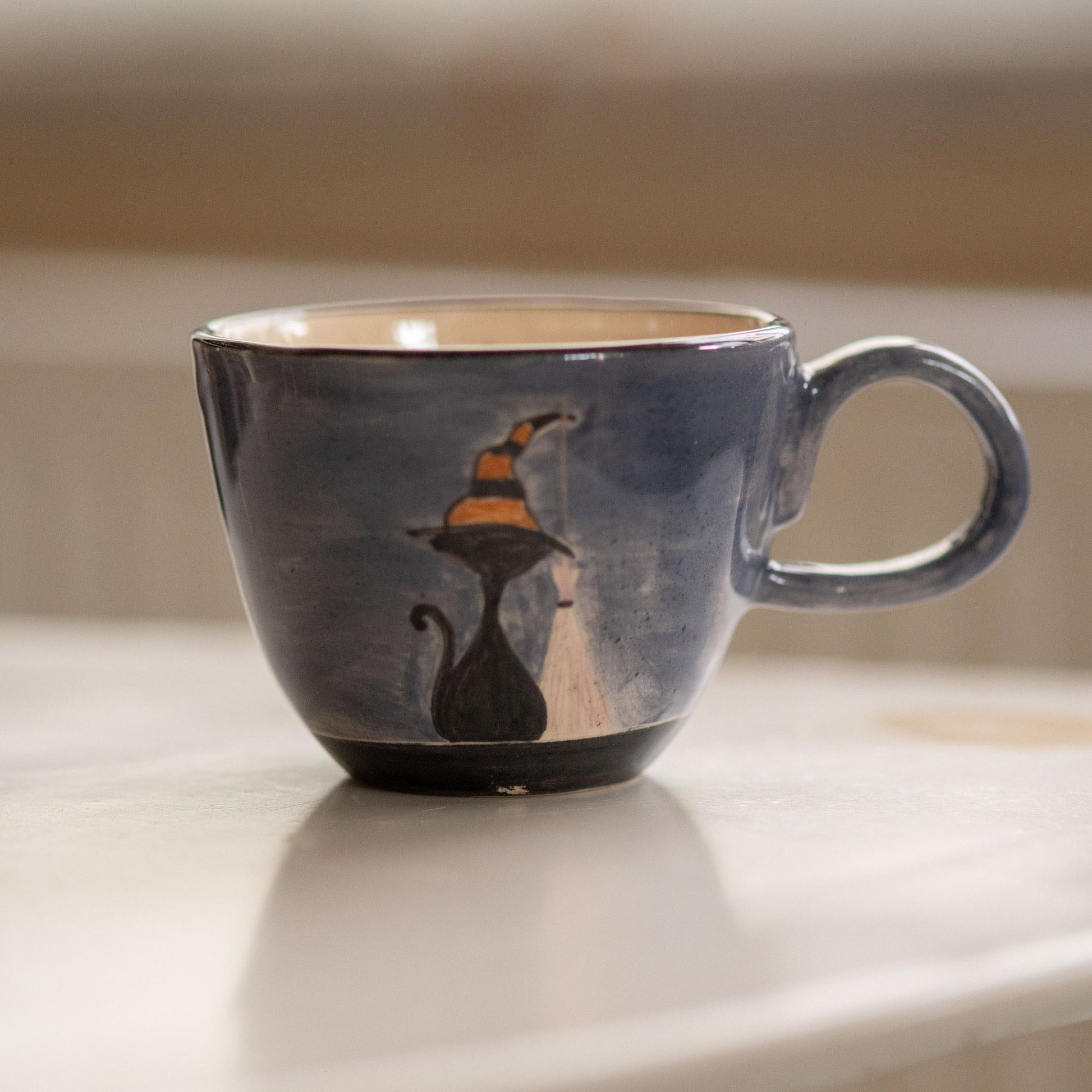 Handcrafted Excellence: Each mug is meticulously hand-shaped and hand-painted, ensuring that every piece is a one-of-a-kind work of art. The black cat and witch hat design are crafted with attention to detail, adding a playful and enchanting element to your drinkware.
